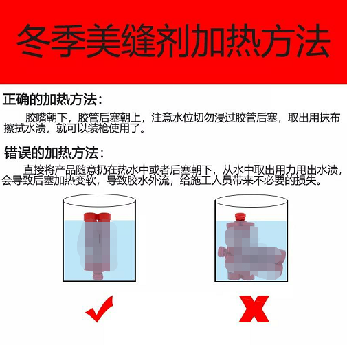 二、冬天氣溫低,美縫劑變稠。打膠阻力增大,如暴力打膠,則導致爆管。所以冬天美縫施工,需要給美縫劑加熱,一般在50-60℃熱水中泡5分鐘左右即可,美縫劑加熱后會變稀, 打膠時阻力變小了,就不會容易出現(xiàn)爆管的現(xiàn)象。