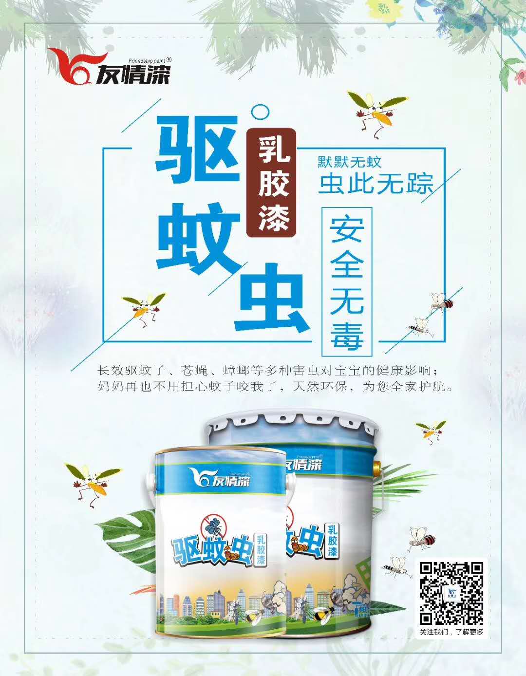 驅(qū)蚊蟲乳膠漆無論是原材料還是所包含的殺蟲元素,對人體和空氣而言都是安全無害的,但是蚊蟲一經(jīng)接觸即會被其中不斷滲透的復(fù)合殺蟲劑殺死,使室內(nèi)的空氣歸于清新自然,人體也免于蚊蟲叮咬的危害。其除了具有驅(qū)蚊功能,還最大限度保持其涂料本身的性能與涂料要求的功能的平衡,滿足到消費者各方面的要求。