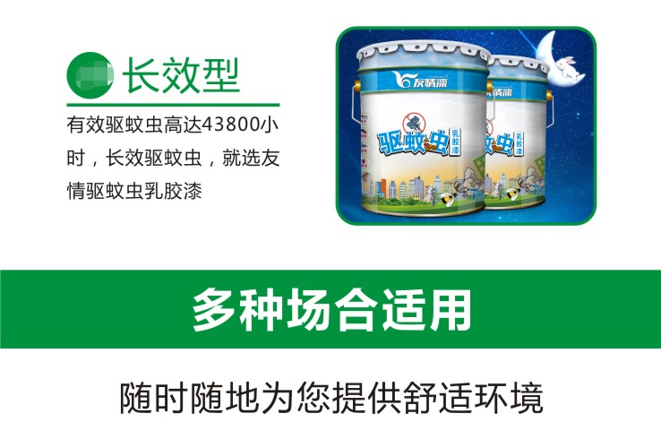 驅蚊蟲乳膠漆除了殺滅蚊子、蒼蠅、蟑螂、跳蚤、臭蟲和蜘蛛等害蟲,為家居創造一個健康寧靜的舒適空間,還具有一般常用建筑涂料的裝飾和保護等功能外,可廣泛應用于住宅、醫院、賓館、辦公樓、公共廁所、倉庫、車船、食品廠、飯店和劇院等許多場合。