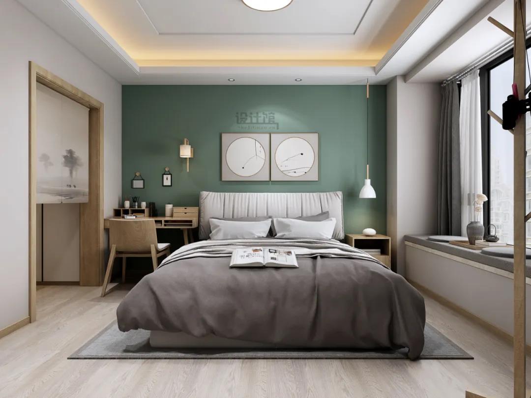 ▲相對較深的綠色,刷在床頭墻上,也讓臥室顯得更加安靜而輕奢高級。