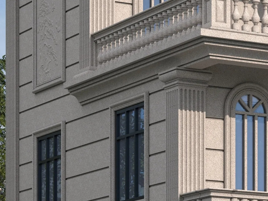 水包砂(荔枝面、火燒面):荔枝面、火燒面仿石既要有石材花紋的色相感,同時又要具備荔枝面、火燒面石材表面彩砂的質感。用手觸感也應該有原石的凹凸面,在粒子色彩方面必須相近,粒子色彩之間要柔和對接,遠看要混為相近色,近看要有粒子的柔和清晰度。