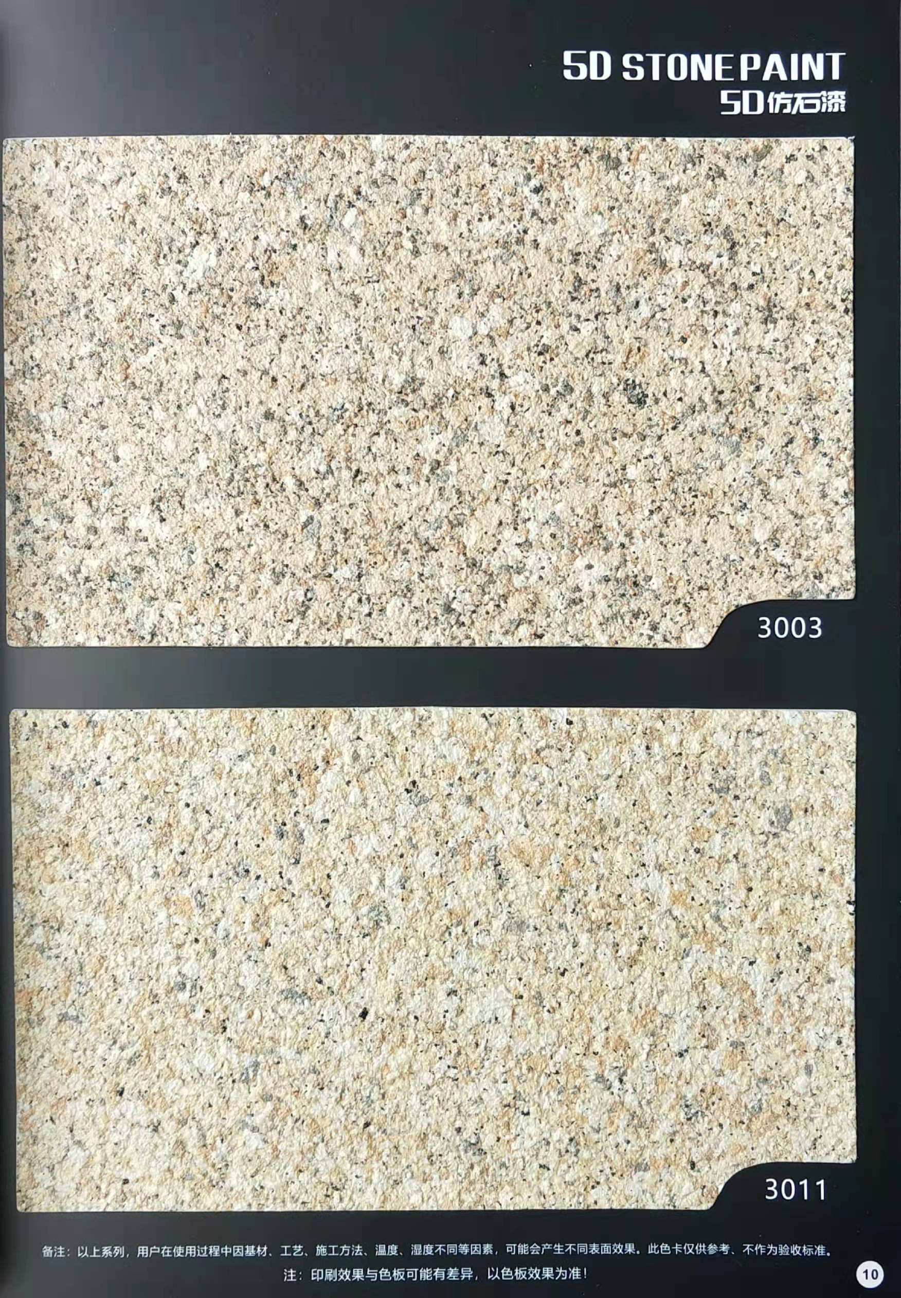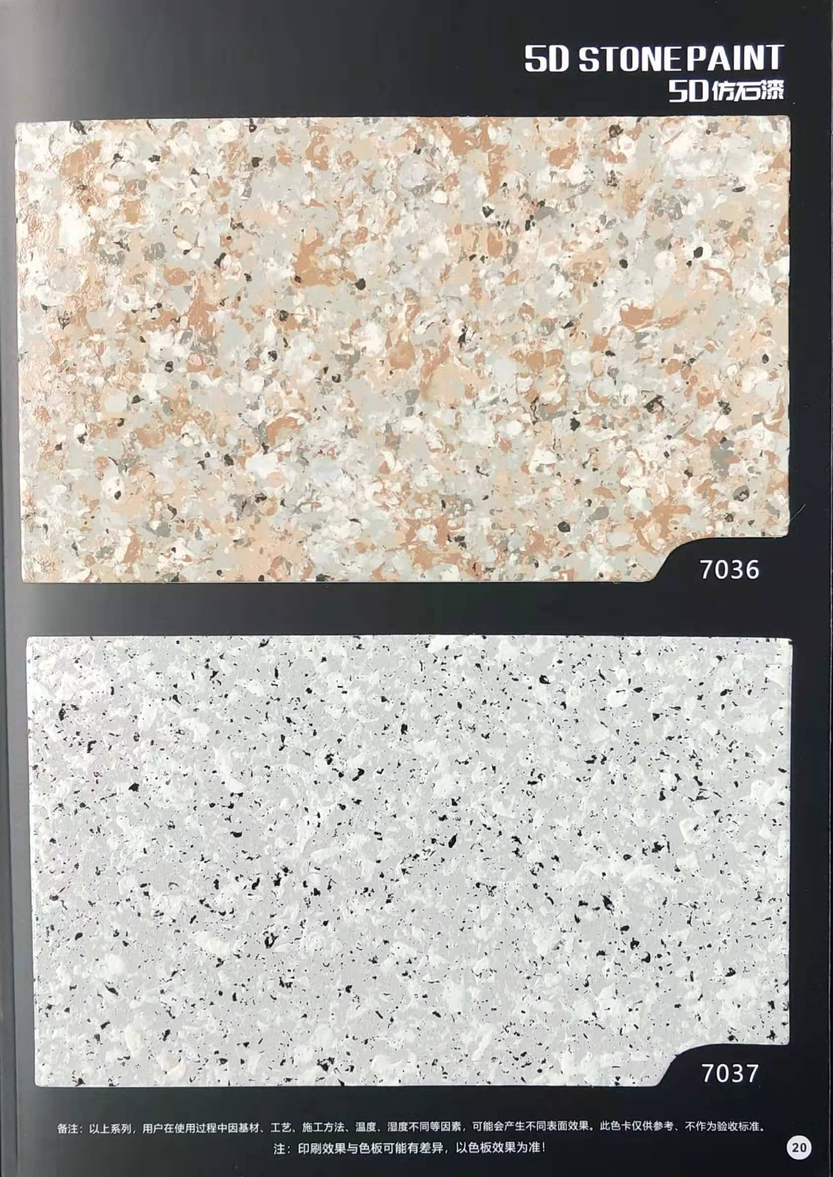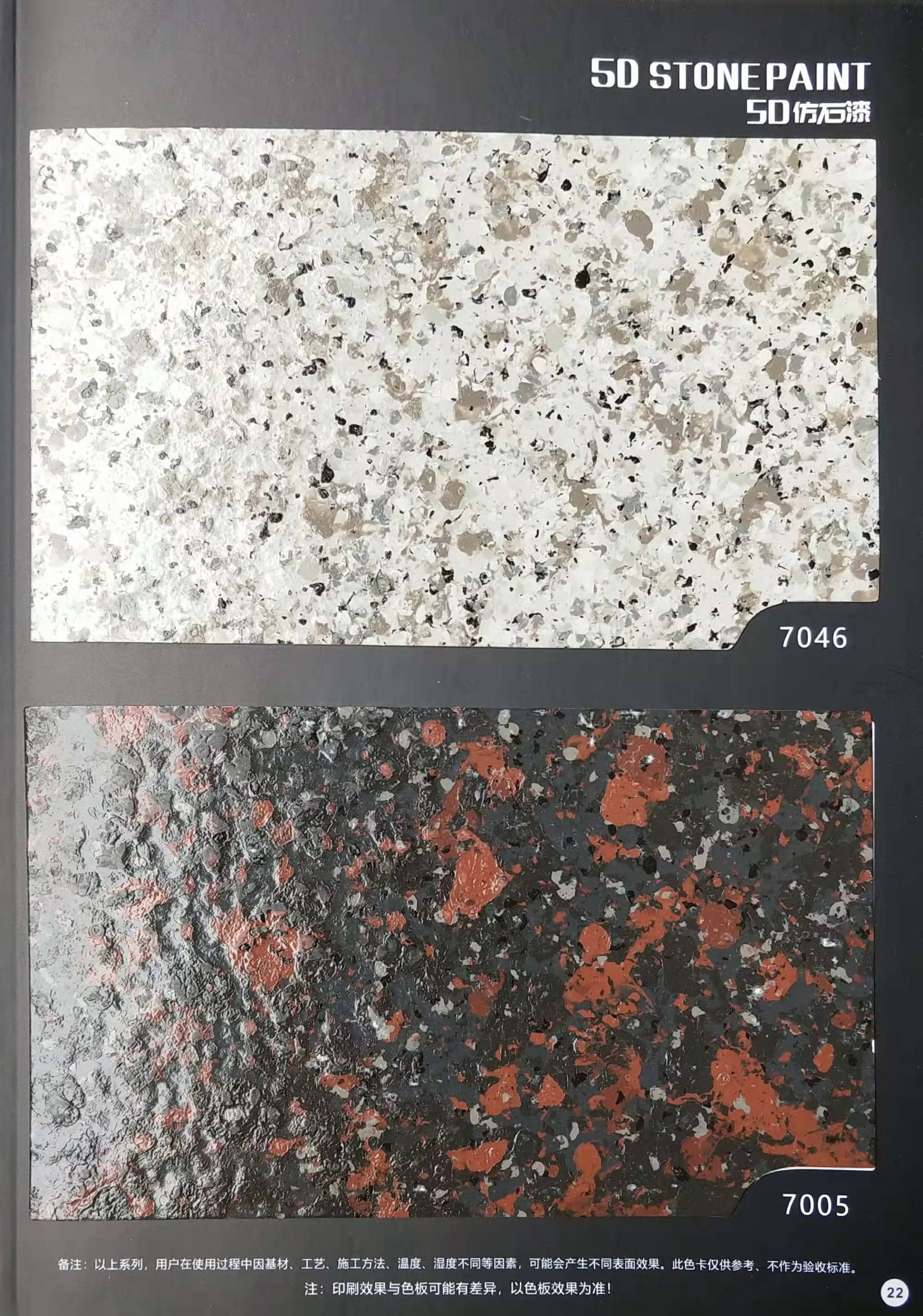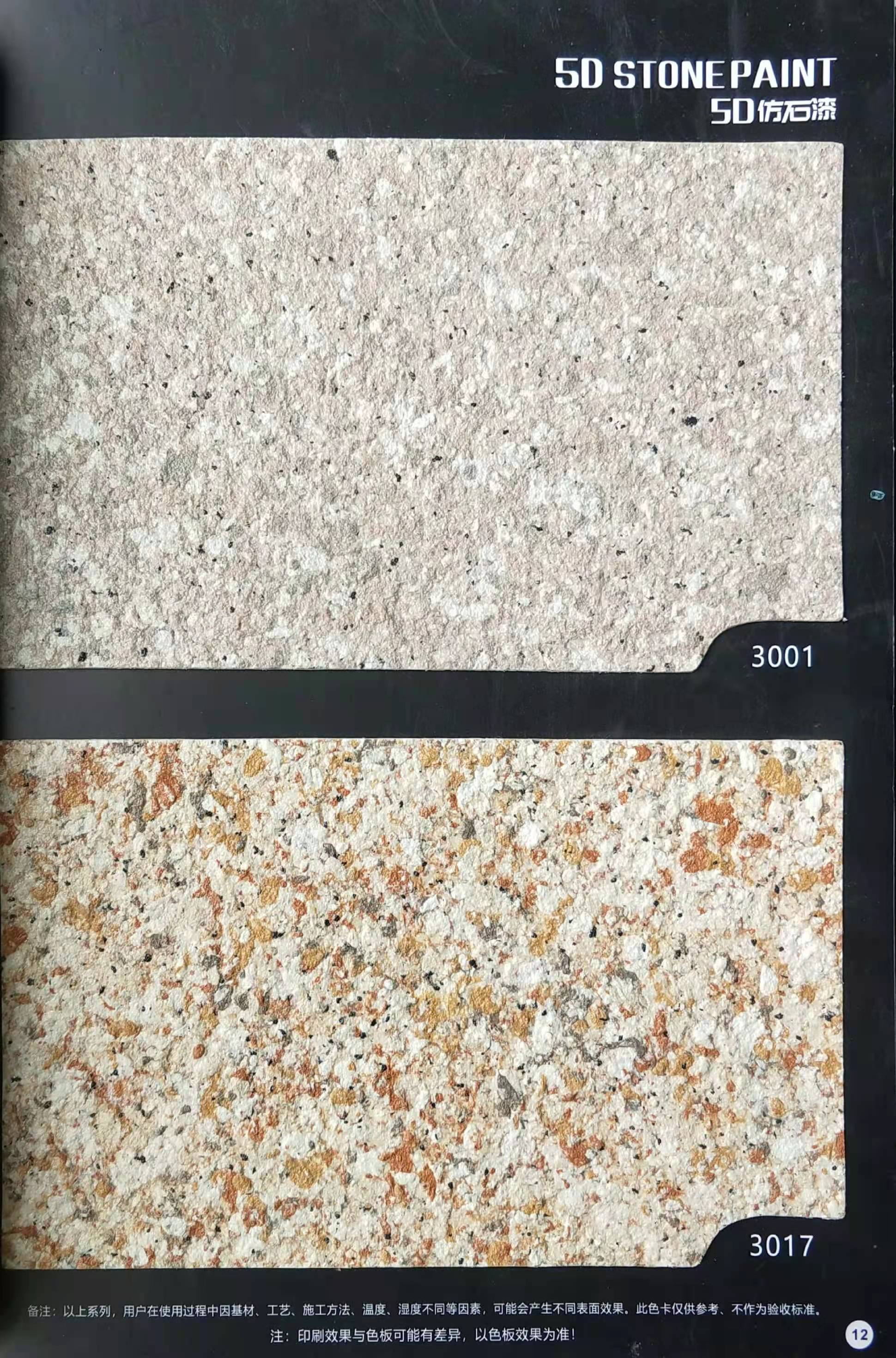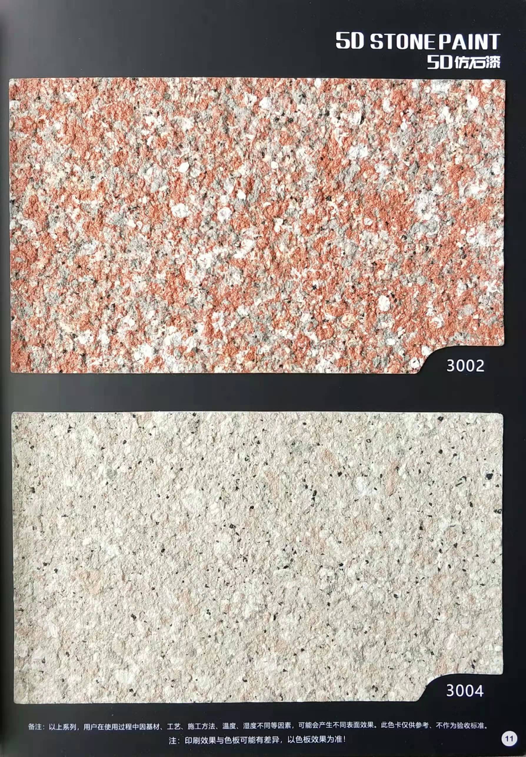 為方便市場客戶對5D仿石漆樣式的選擇,滿足消費者對其產品效果的體現,友情漆現在推出一套全方景立體式展現,用不同色彩仿石漆組合裝飾出來的墻面效果圖冊。