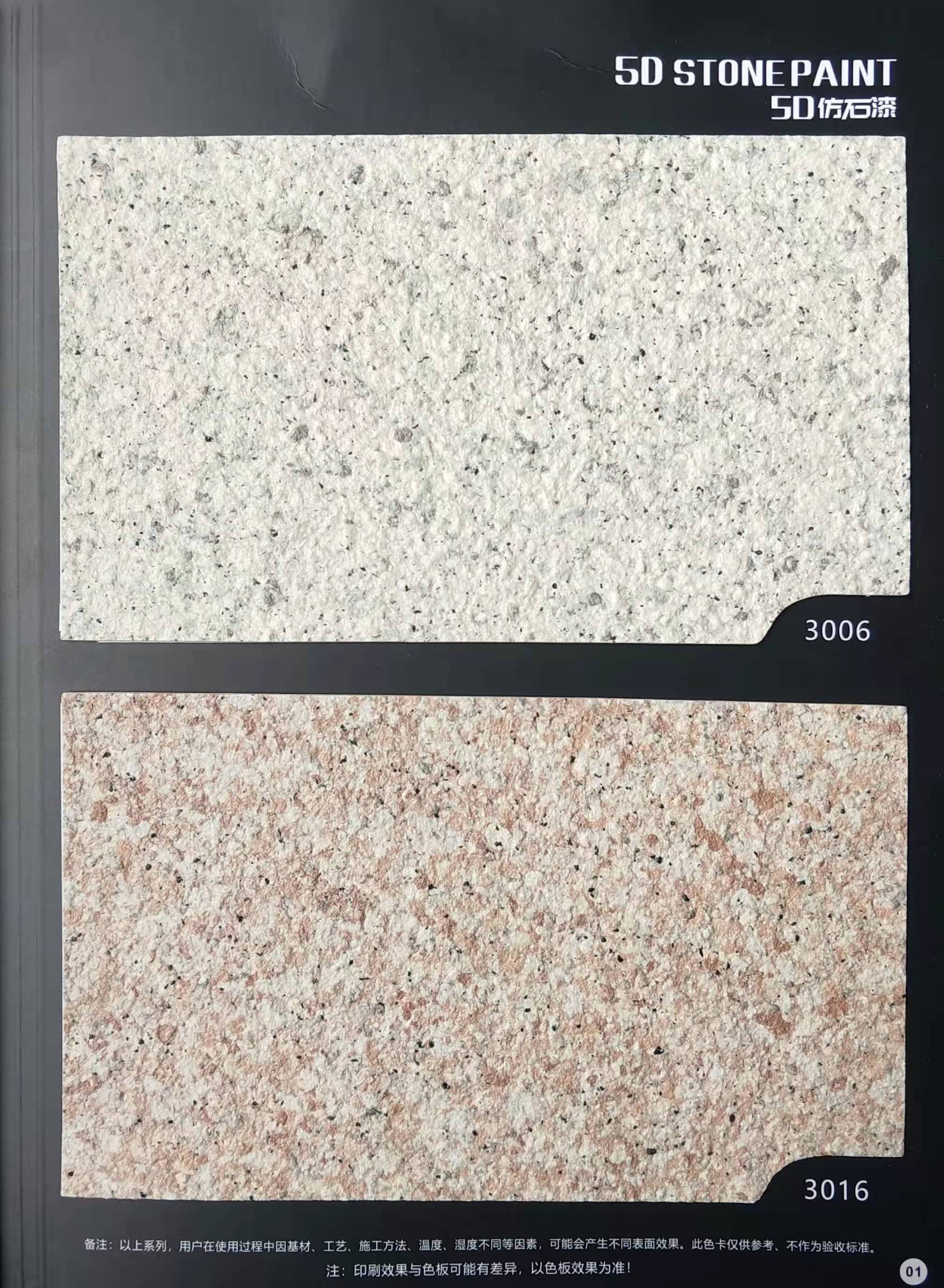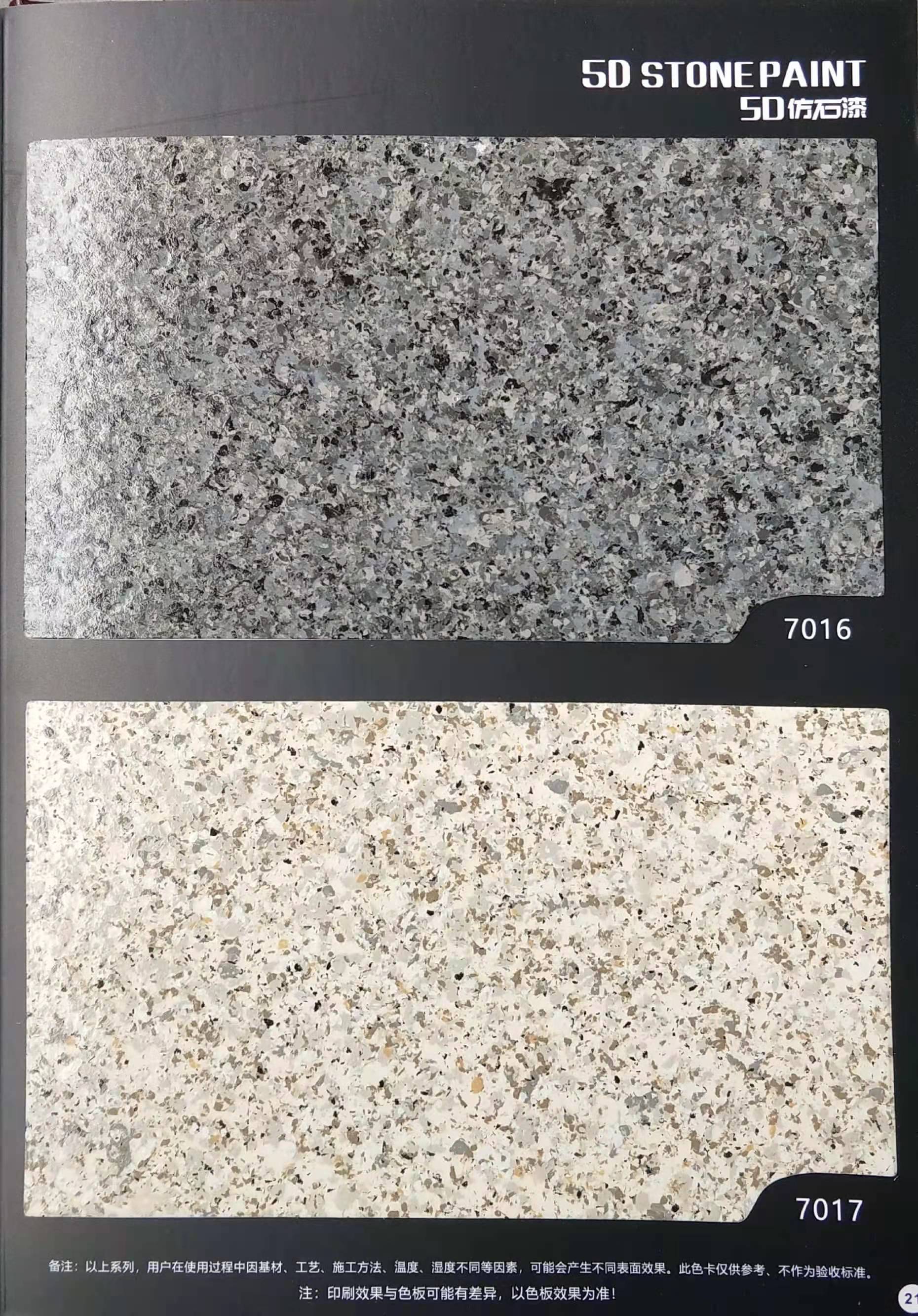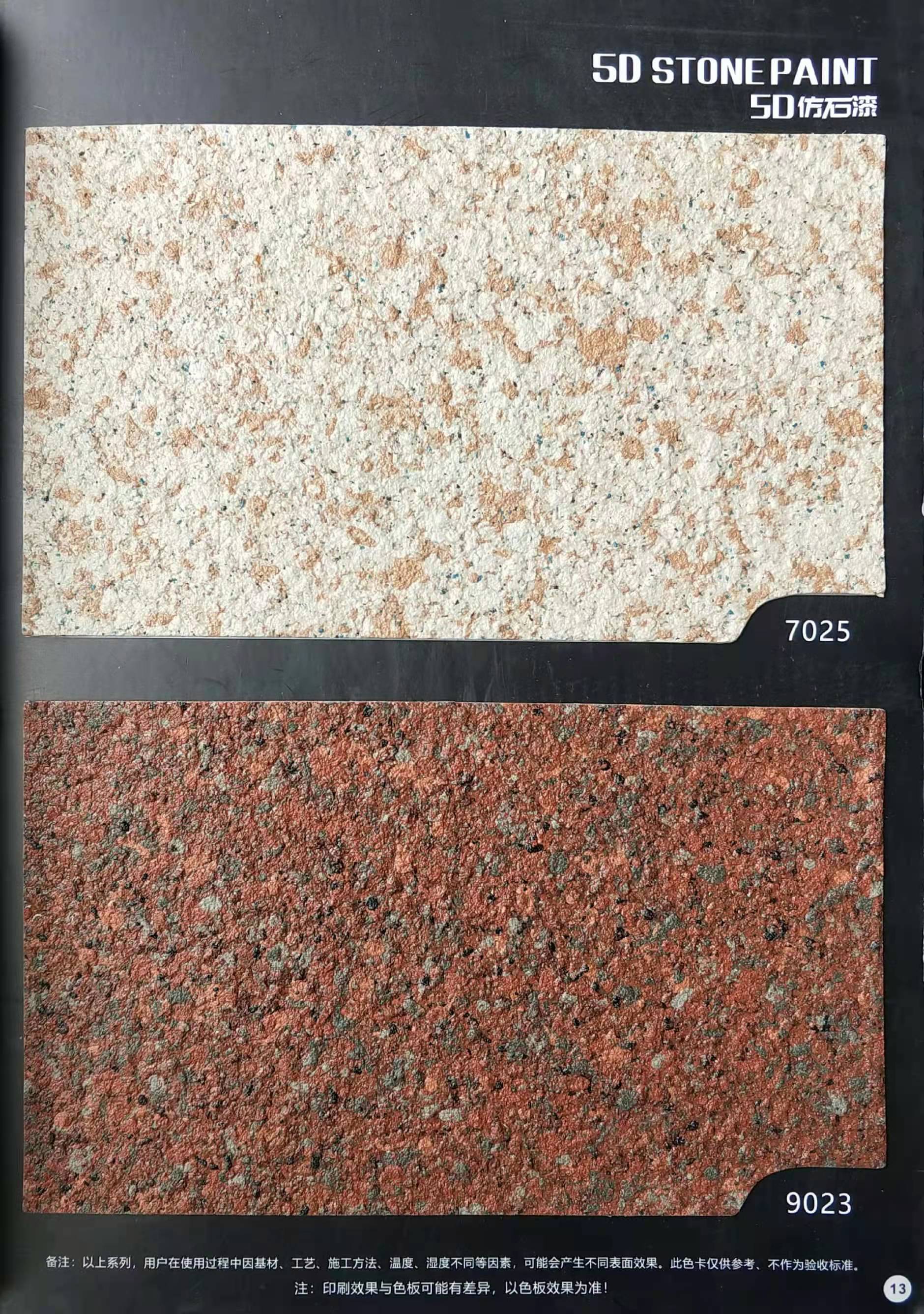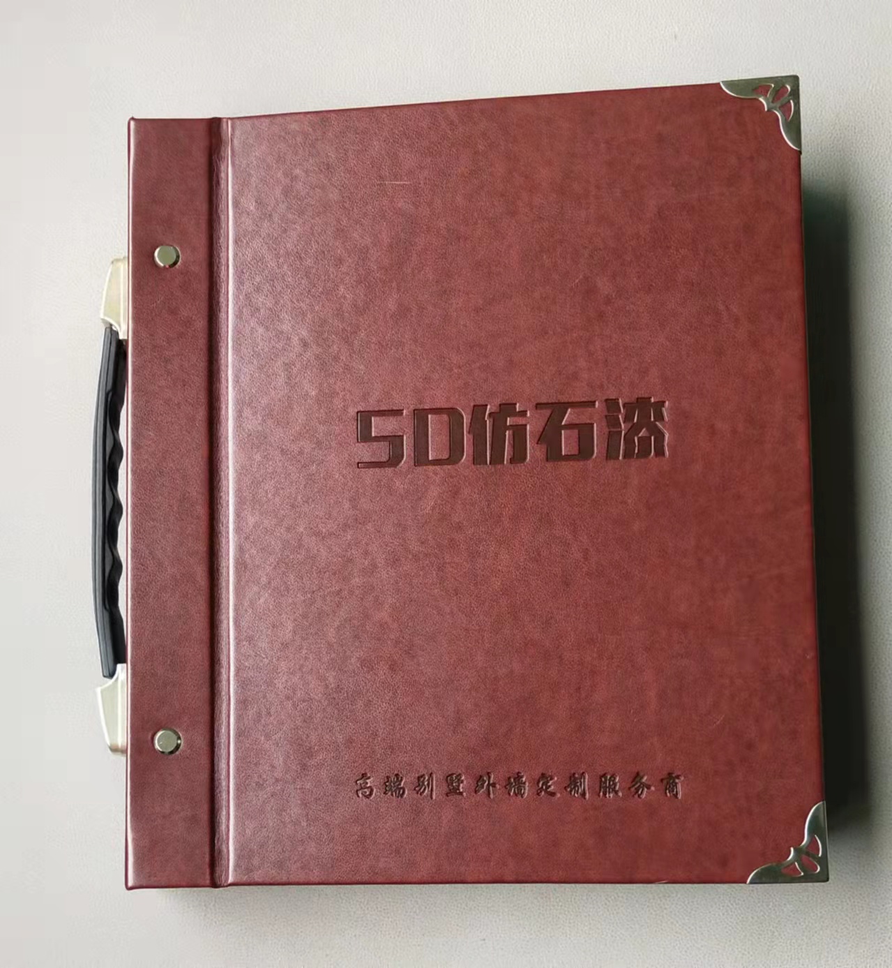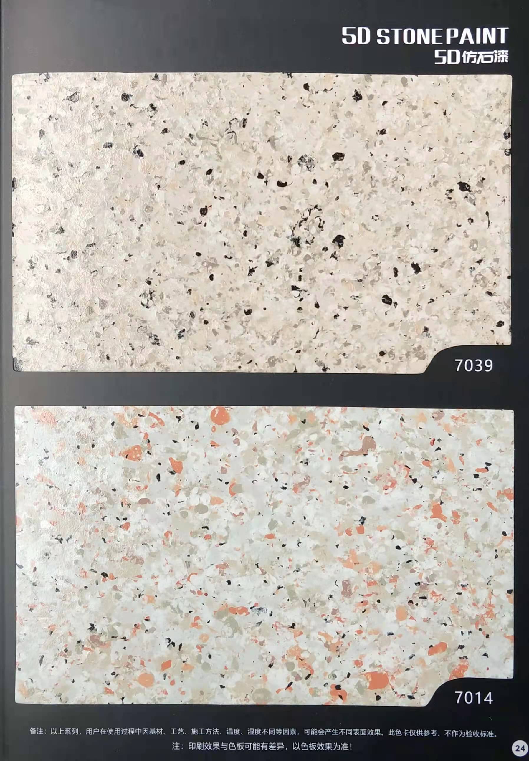 為方便市場客戶對5D仿石漆樣式的選擇,滿足消費者對其產品效果的體現,友情漆現在推出一套全方景立體式展現,用不同色彩仿石漆組合裝飾出來的墻面效果圖冊。