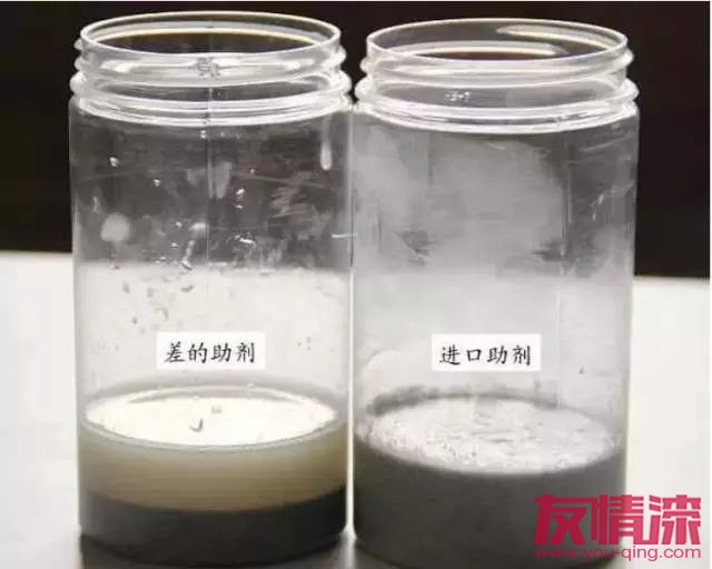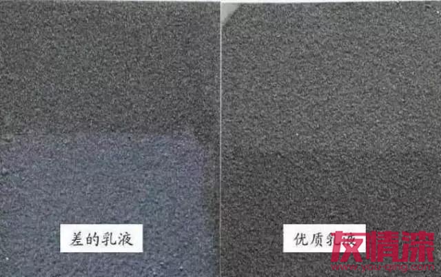 優質彩砂,在生產高速攪拌過程中,由于硬度高,耐摩擦,不易粉化,最終做出的涂層效果,彩砂顆粒非常清晰,富有質感和光澤。(如上圖所示)如果涂層顏色鮮艷,3元/公斤以下的真石漆,只能添加色漿,因為鮮艷色的高溫煅燒砂,一公斤售價就在2.5-3.5元不等。(上圖為添加了色漿的真石漆)乳液作為真石漆的成膜物質,其質量的高低直接決定涂層的性能。比如(耐黃變性、防水性、使用壽命等)上圖為,差的乳液與優質乳液在實驗室進行耐紫外線測試的結果。差的乳液,耐紫外線非常差,太陽照射不久之后,會出現黃變。耐水性為衡量乳液最重要的指標之一。差的乳液耐水性非常差,遇水就會出現發白的現象。上圖為采用差的乳液與優質乳液的真石漆耐水性測試對比。如上圖所示,采用了差的乳液做出的真石漆,天一下雨,水就會滲透到涂層中,出現泛白現象。水經常滲透到涂層,會大大降低涂層的使用壽命。差的真石漆,廠家為了壓縮成本,乳液的含量一般都比較低,噴涂過程中飛濺,嚴重浪費,導致涂布量大增。一般真石漆的正常用量一平米3-4公斤,低價低檔真石漆,由于浪費嚴重,損耗大,涂布量每平米往往要超出4公斤,有的甚至達到5公斤。真石漆的助劑用量雖少,但卻決定著整個配方體系穩定性。質量差的助劑,產品放置一定時間后,就會出現嚴重的分層現象。(如上圖所示)首先,我們會想到當地的小作坊;事實上,2014年房地產行業深度調整,成本控制力度空前加大,一些大型綜合性涂料企業為了參與競爭,也開始生產低質、低價的苯丙真石漆。
