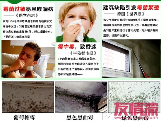 漂白水(粉)加水以1:99的比例倒進噴水瓶,噴在有發霉的墻面可立即解決墻面發霉問題。用抹布擦拭墻面;再以清水洗凈,墻面干燥后刷上防霉漆,則能長時間防潮。此外,市面上還有一種家用的便捷型防水修復劑,只需跟殺蟲劑一樣朝滲漏墻地面的縫隙噴一下就可以了,操作起來十分便利。