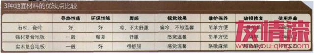 安裝地暖后通常配合瓷磚、強化木地板和實木地板,三者各有優劣具體可以參考下圖