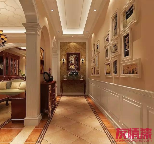 如果條件允許的,可以在走廊的墻面掛上像盤子等藝術(shù)品,也可以在墻面挖個壁龕放置藝術(shù)品等;對于喜歡藝術(shù)品的人來說,這種墻面裝飾方式是最好不錯的了。