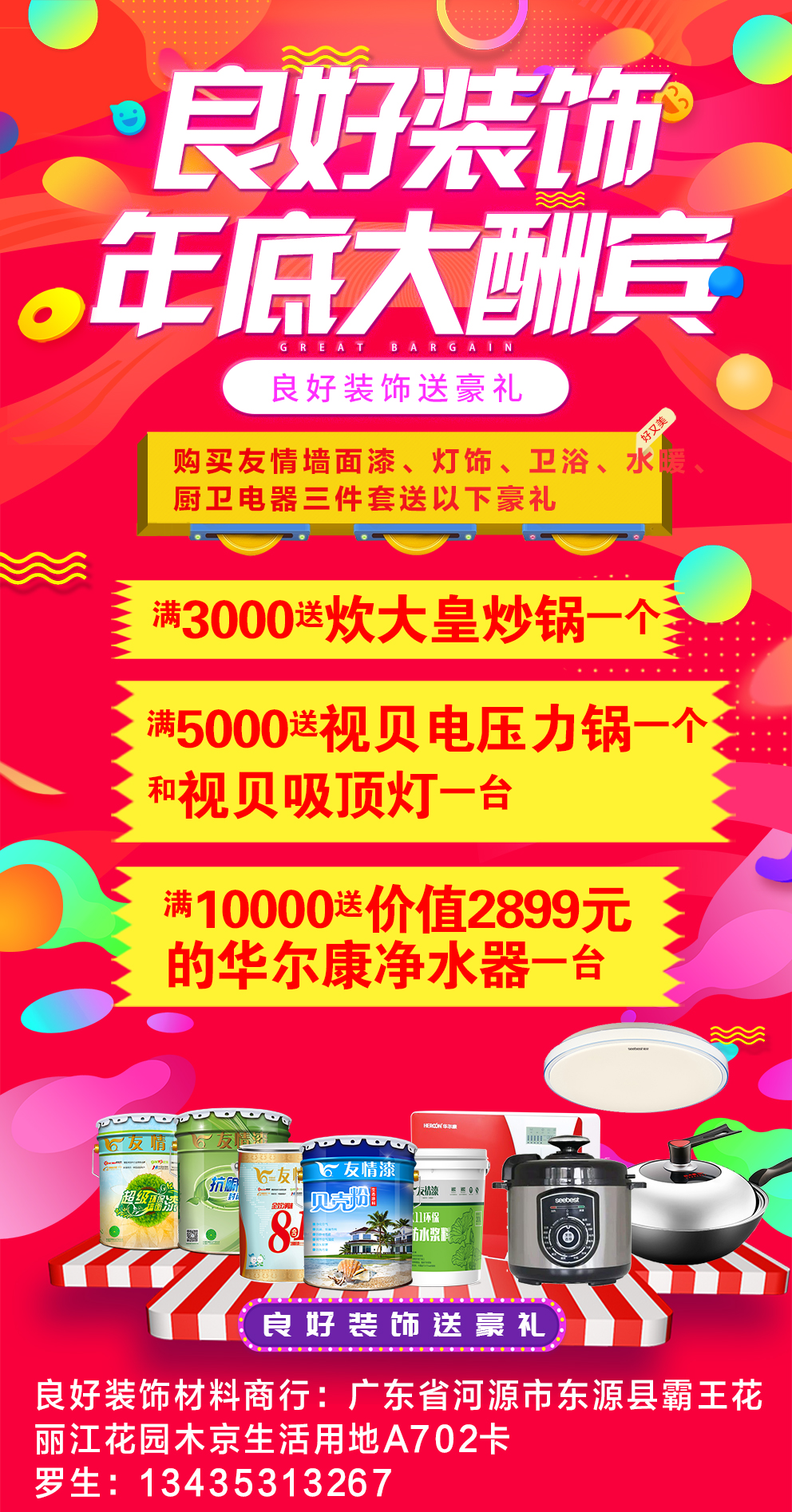 友情漆河源總代理良好裝飾行,在這一次的年底促銷活動(dòng)中,一次性送出的高達(dá)2900價(jià)值的禮品。其中,消費(fèi)滿3000元贈(zèng)送名牌炒鍋一個(gè),消費(fèi)滿5000元贈(zèng)送名牌壓力鍋一個(gè)和吸頂燈一盞,消費(fèi)滿10000元贈(zèng)送價(jià)值2900元的名牌凈水器一臺。