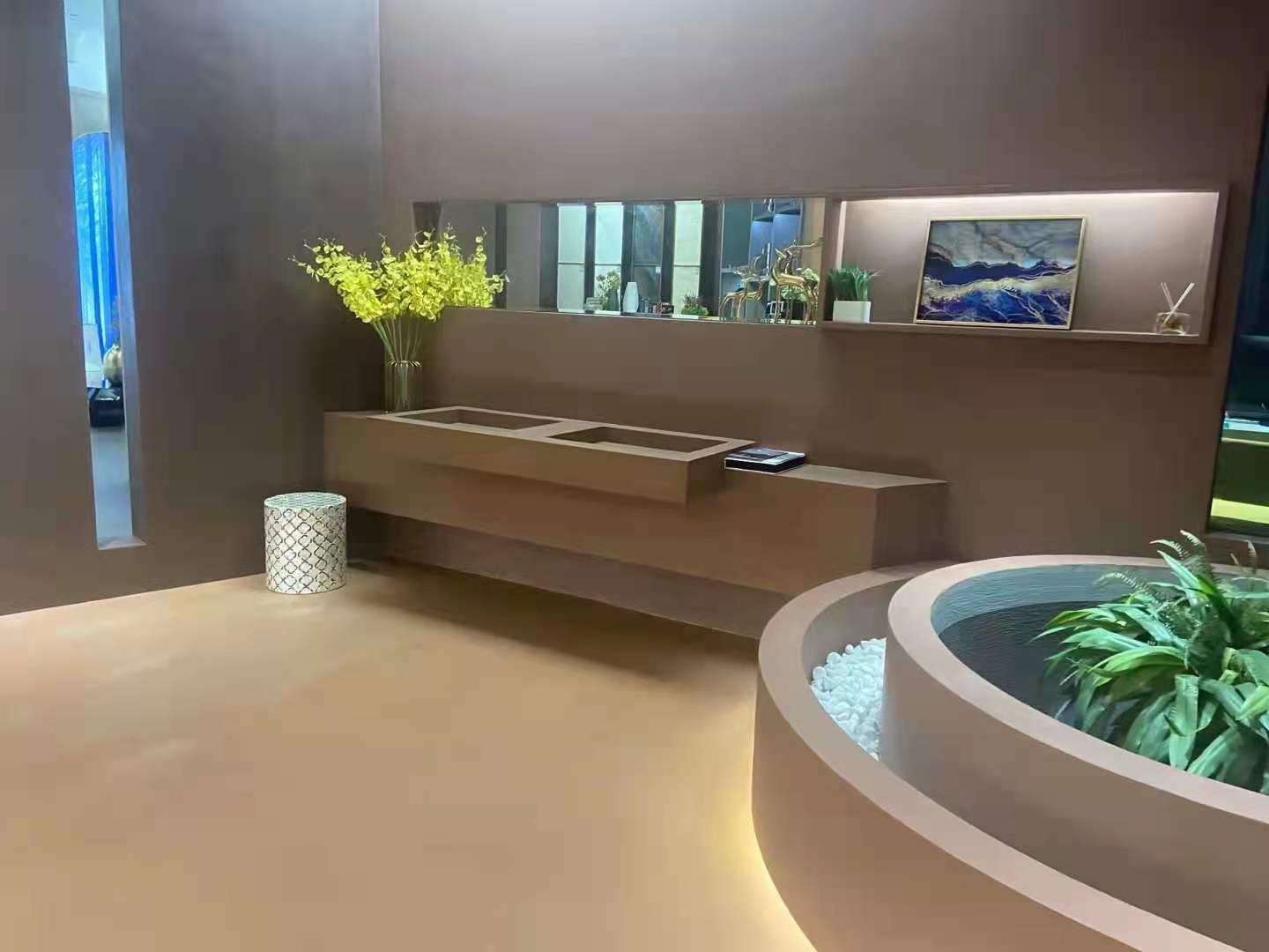 有效提升設(shè)計整體性,由于微水泥的完成面厚度非常的薄,作用于地面時,微水泥地面的完成厚度只有 3 毫米,而做在墻面時,它的厚度可以在 0.5 到 1 毫米之間,可以做出非常漂亮的無縫、連續(xù)性的表面,同時,如果有一些特殊的造型也可以很好的進行貼合。