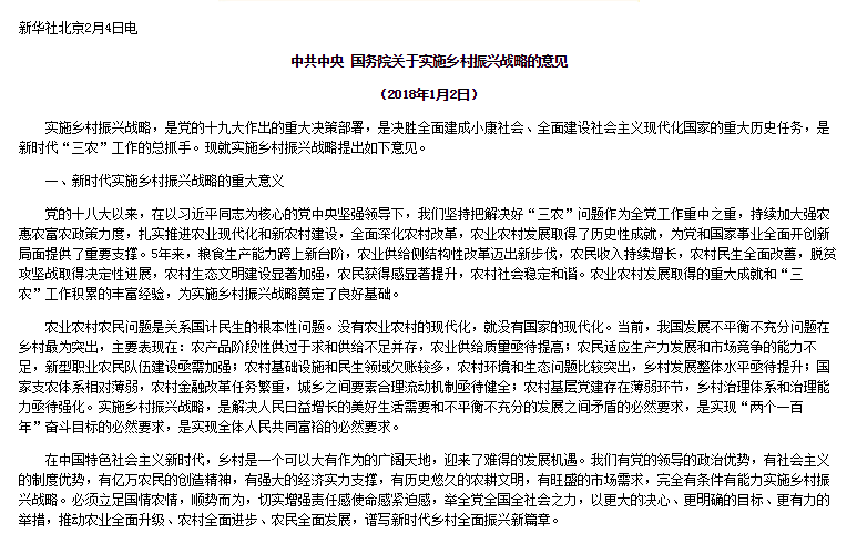 在2018年中央一號文件里,對實施鄉村振興戰略進行了全面部署,明確提出加大國家重點生態功能區轉移支付力度。