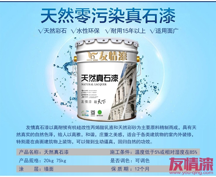 真石漆是復層涂料,同底漆、防水面漆組成。是以純丙烯酸聚臺物及天然彩砂為原料,涂層堅硬,粘結性好,耐用時間超長,防污性好,陰阻燃,耐酸堿。